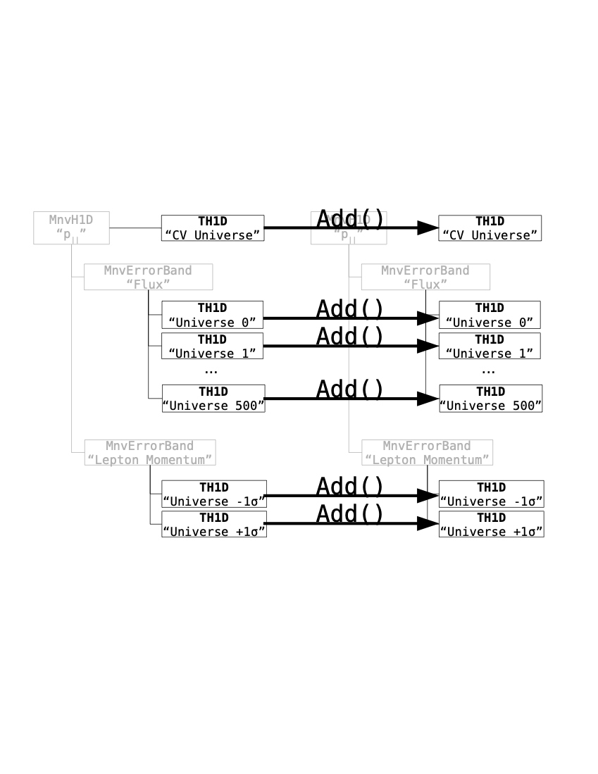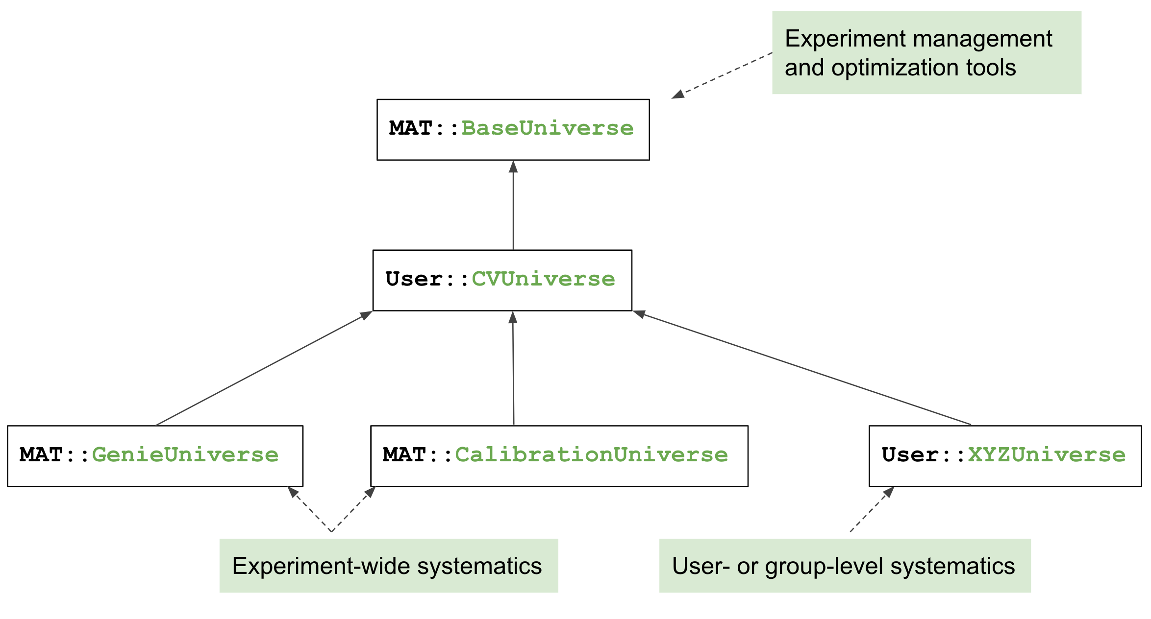 };In the MAT namespace, experiments set experiment-wide constants, interfaces and systematics. Users and groups implement analysis-specific systematics and calculators. Here, the calibration process impacts the lepton energy, moving events in and out of the cuts when that universe is processed in the event loop.
